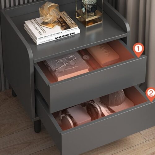 - Thiết Kế 2 Ngăn Kéo Kín: Tủ bao gồm hai ngăn kéo lớn được xếp chồng lên nhau, cung cấp không gian kín đáo để cất giữ vật dụng cá nhân, sách, thuốc men hoặc các đồ vật khác cần sự riêng tư. Bề mặt ngăn kéo được thiết kế phẳng và thường sử dụng tay nắm chìm hoặc rãnh vát để duy trì vẻ ngoài tối giản.