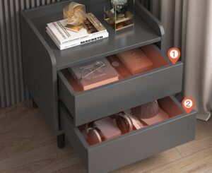 - Thiết Kế 2 Ngăn Kéo Kín: Tủ bao gồm hai ngăn kéo lớn được xếp chồng lên nhau, cung cấp không gian kín đáo để cất giữ vật dụng cá nhân, sách, thuốc men hoặc các đồ vật khác cần sự riêng tư. Bề mặt ngăn kéo được thiết kế phẳng và thường sử dụng tay nắm chìm hoặc rãnh vát để duy trì vẻ ngoài tối giản.