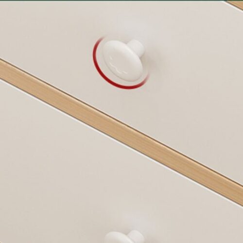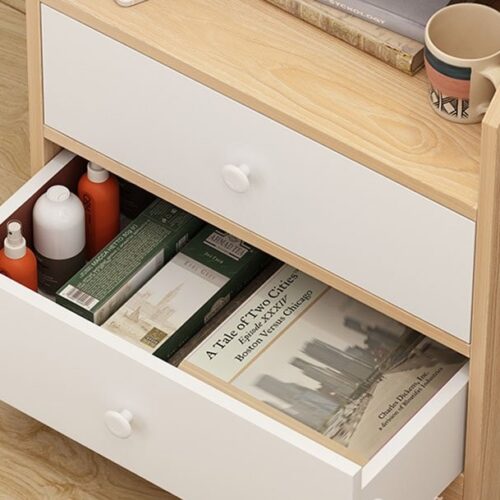 - Chất Liệu Gỗ Công Nghiệp: Tủ được làm từ gỗ công nghiệp (MDF hoặc MFC) với bề mặt phủ vân gỗ sáng màu (cho khung) và màu trắng (cho mặt ngăn kéo), tạo nên sự kết hợp tươi sáng và ấm áp