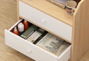 - Chất Liệu Gỗ Công Nghiệp: Tủ được làm từ gỗ công nghiệp (MDF hoặc MFC) với bề mặt phủ vân gỗ sáng màu (cho khung) và màu trắng (cho mặt ngăn kéo), tạo nên sự kết hợp tươi sáng và ấm áp