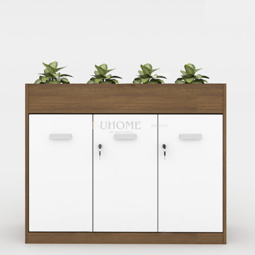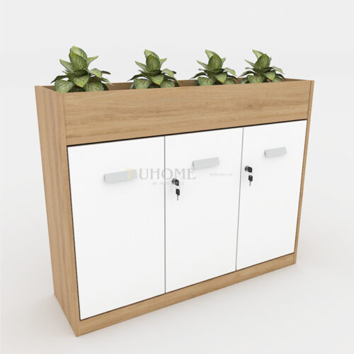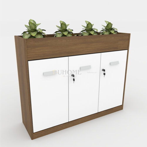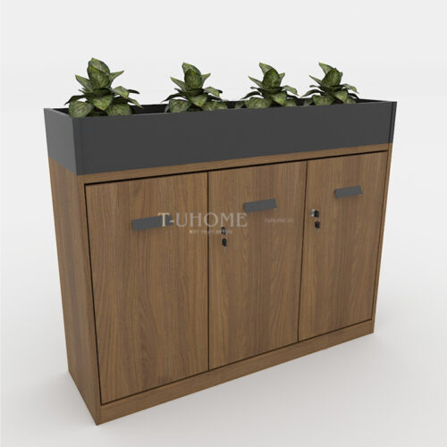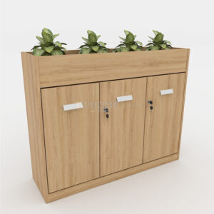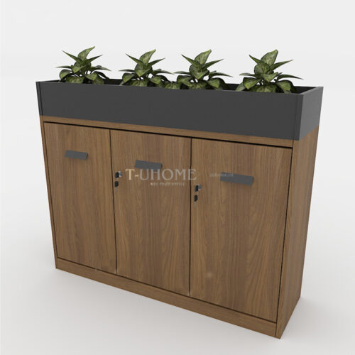 Bên dưới là hệ tủ 3 cánh mở có khóa, bố trí cân đối và tiện dụng. Các cánh tủ sử dụng tay nắm âm màu tối đồng điệu với phần chậu cây, giúp tổng thể hài hòa và tinh gọn. Khoang tủ rộng rãi phù hợp để lưu trữ hồ sơ, tài liệu, vật dụng văn phòng hoặc đồ cá nhân, giữ không gian luôn gọn gàng và chuyên nghiệp.