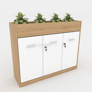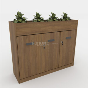 Bên dưới là hệ tủ 3 cánh mở có khóa, bố trí cân đối và tiện dụng. Các cánh tủ sử dụng tay nắm âm màu tối đồng điệu với phần chậu cây, giúp tổng thể hài hòa và tinh gọn. Khoang tủ rộng rãi phù hợp để lưu trữ hồ sơ, tài liệu, vật dụng văn phòng hoặc đồ cá nhân, giữ không gian luôn gọn gàng và chuyên nghiệp.
