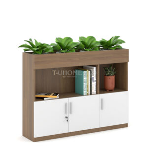 Phần chậu cây phía trên thiết kế dạng khay dài, đặt được nhiều chậu cây nhỏ giúp không gian làm việc trở nên sinh động và gần gũi hơn. Màu gỗ sáng của tủ kết hợp với sắc xanh tươi của cây tạo cảm giác thư giãn, hỗ trợ cải thiện không khí cũng như tăng tính thẩm mỹ cho văn phòng.