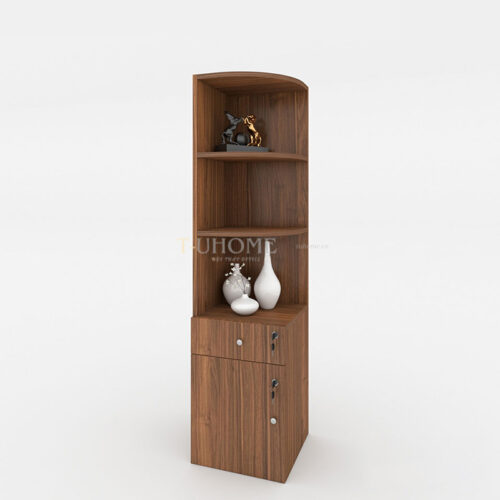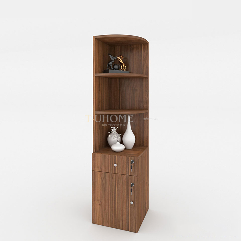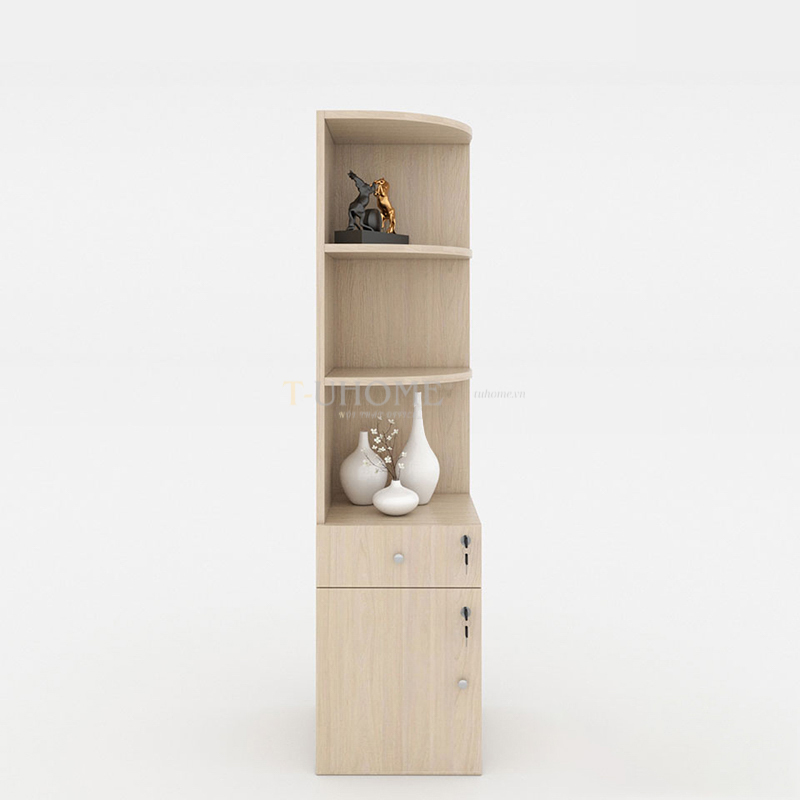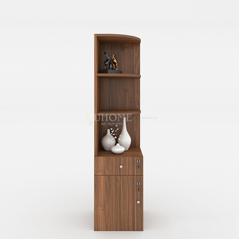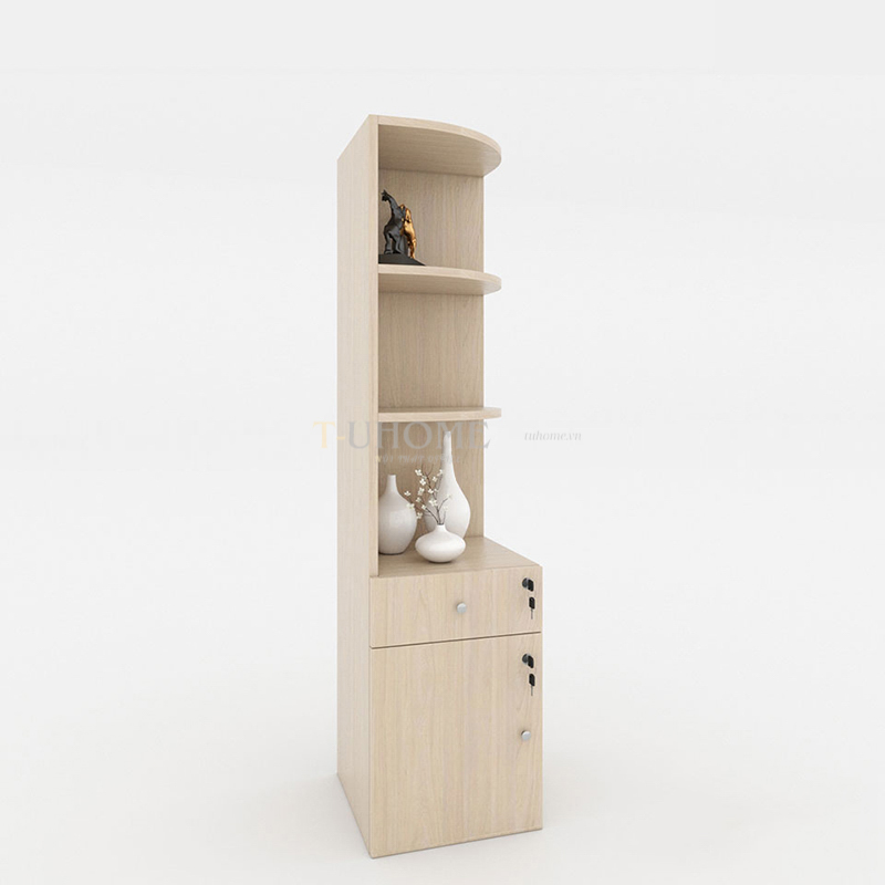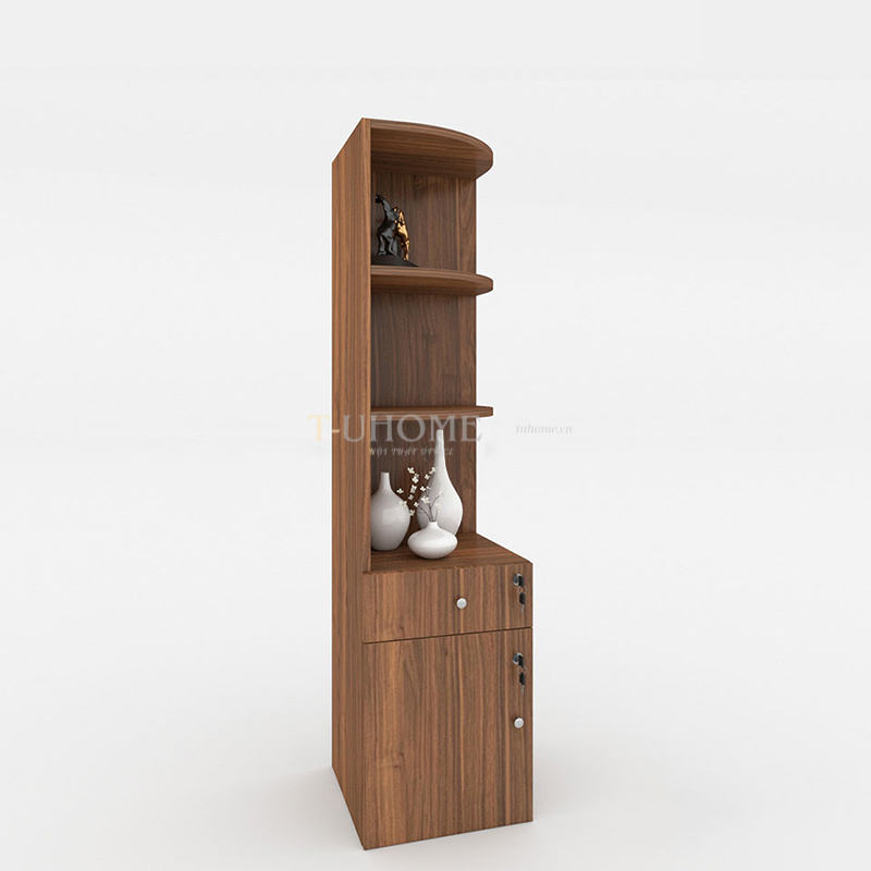 Phần trên của tủ gồm hai tầng mở, được thiết kế bo tròn góc cạnh giúp tổng thể trở nên mềm mại và hiện đại hơn. Đây là không gian lý tưởng để đặt các tài liệu thường xuyên sử dụng, sách, hoặc những món decor nhỏ như tượng trang trí và bình gốm, giúp không gian làm việc trở nên sinh động và tràn đầy cảm hứng.