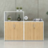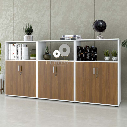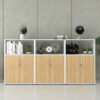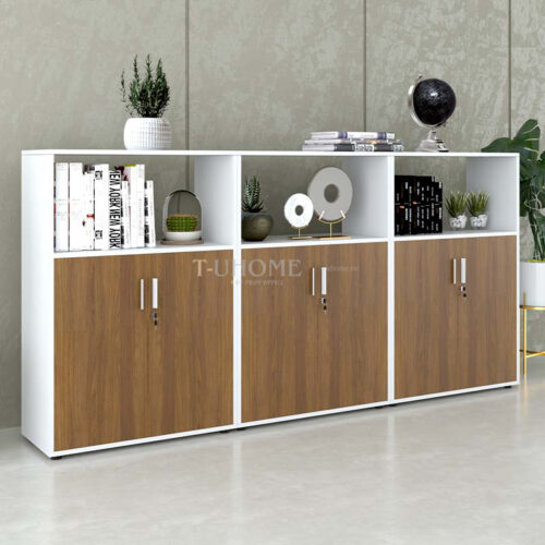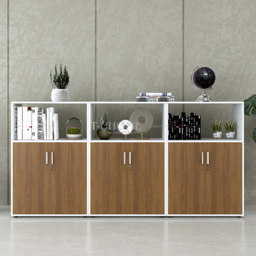 Phần khoang dưới của mỗi tủ gồm hai cánh mở kín đáo, sử dụng tay nắm kim loại hiện đại và tích hợp ổ khóa bảo mật. Người dùng có thể lưu trữ những loại hồ sơ quan trọng, sổ sách nội bộ, hợp đồng hoặc vật dụng cá nhân mà vẫn đảm bảo an toàn và ngăn nắp. Bên trong mỗi khoang chứa được chia thành các đợt để tối ưu khả năng sắp xếp khoa học.