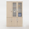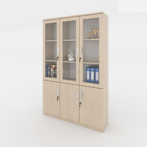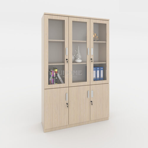 Phần trên của tủ gồm 3 khoang cánh kính trong suốt, thuận tiện để trưng bày tài liệu, hồ sơ, cúp lưu niệm hoặc vật dụng trang trí. Các đợt tủ được bố trí hợp lý, tạo không gian lưu trữ lớn và thoáng.