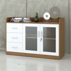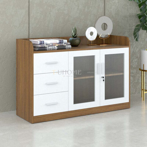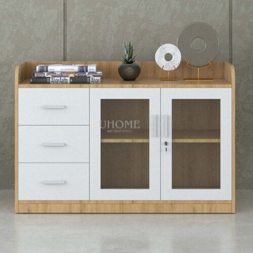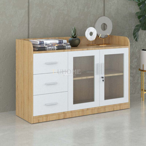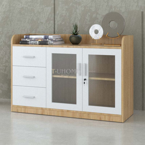 Tủ được chia thành hai khu vực lưu trữ riêng biệt: bên trái là ba hộc kéo rộng rãi, phù hợp để cất giữ giấy tờ, tài liệu cá nhân hoặc các vật dụng văn phòng nhỏ. Mỗi ngăn kéo đều được trang bị tay nắm chắc chắn, thao tác kéo mở mượt mà. Bên phải là hai cánh cửa kính trong suốt, vừa mang lại vẻ hiện đại vừa giúp dễ dàng quan sát tài liệu bên trong. Khoang tủ lớn này đáp ứng tốt nhu cầu lưu trữ hồ sơ dạng bìa còng hoặc hộp tài liệu khổ lớn.