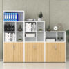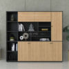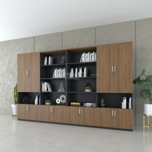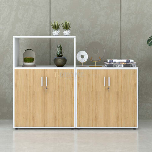 Phần dưới của tủ gồm nhiều cánh tủ ngang trải dài toàn bộ chiều rộng. Đây là khu vực có sức chứa lớn, giúp sắp xếp tài liệu gọn gàng theo từng nhóm, đồng thời tạo sự sạch sẽ và hạn chế lộ đồ dùng ra bên ngoài. Kiểu bố trí này cũng giúp không gian làm việc luôn tinh gọn, chuyên nghiệp.